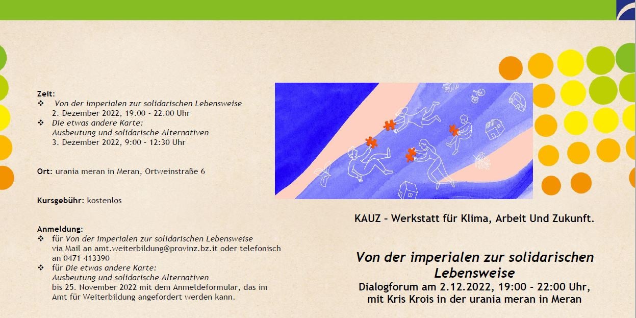 Wie es möglich ist, von einer imperialen zu einer solidarischen Lebensweise zu wechseln, darum geht es bei einem Dialogforum des Amtes für Weiterbildung am Freitag, 2. Dezember, in Meran.