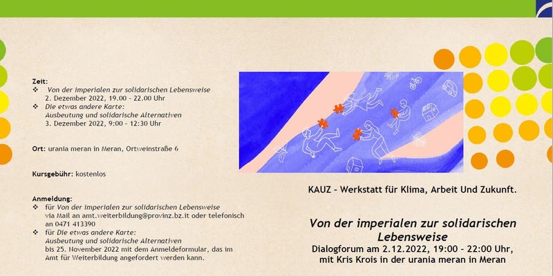 Der Referent Kris Krois, der an der Freien Universität Bozen den Masterlehrgang in Eco-Social Design leitet und die jährliche Konferenz "By Design or by Disaster" organisiert, wird das Konzept der imperialen Lebensweise der beiden Politikwissenschaftler Ulrich Brand und Markus Wissen umreißen. Ebenso wird er die Vision der solidarischen Lebensweise präsentieren, die vom ILA Kollektiv, einer Gruppe engagierter Wissenschaftler und Wissenschaftlerinnen, entwickelt wurde. Im anschließenden Dialog versuchen die Teilnehmenden beides besser zu verstehen, und Elemente der Transformation von der imperialen Lebensweise zur solidarischen Lebensweise zu verknüpfen.