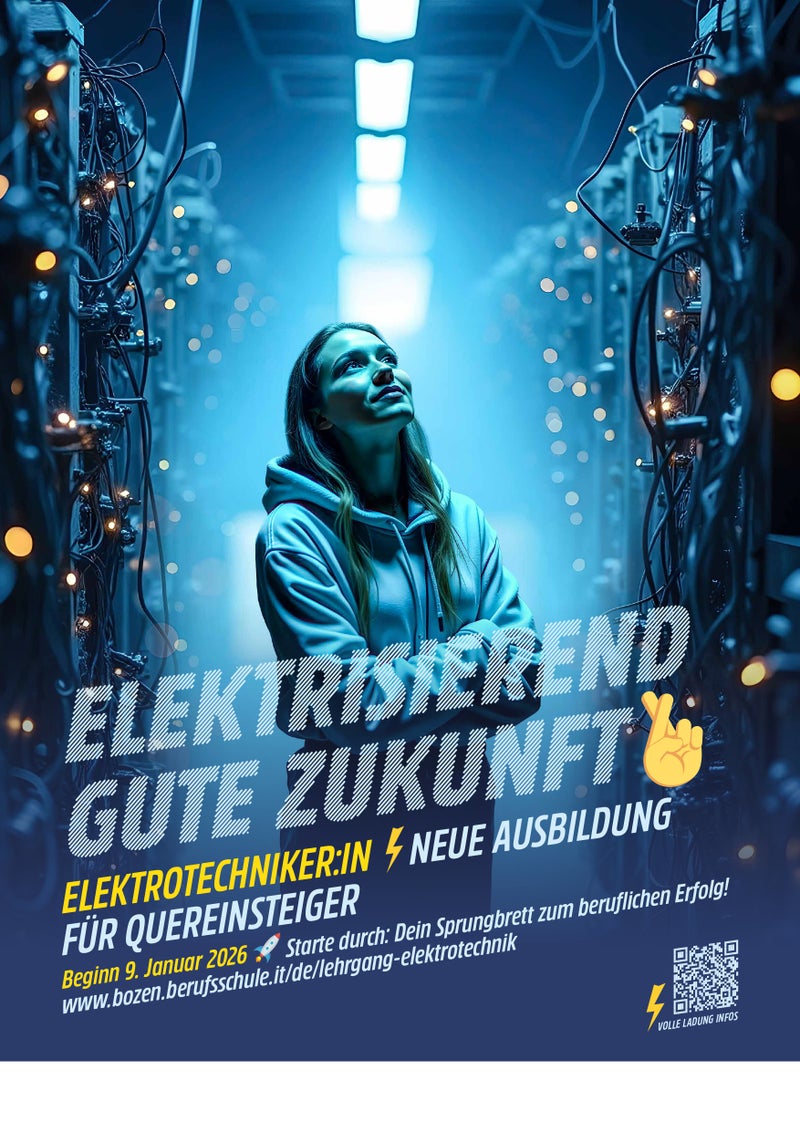 Wer daran interessiert ist, kann sich zum Online-Informationstreffen am 10. September um 17 Uhr anmelden. Informationen sind erhältlich im Weiterbildungsbüro der Landesberufsschule für Handwerk und Industrie, Telefon 0471 540720, E-Mail weiterbildung@berufsschule.bz, oder online unter www.bozen.berufsschule.it/de/lehrgang-elektrotechnik