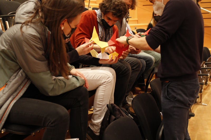 - Selbst testen: Lehrpersonen konstruierten bei der Mathematik-Tagung gemeinsam ein Dodekaeder (Körper mit zwölf Flächen). (Foto: LPA/Deutsche Bildungsdirektion) » [IMG 2 MB]