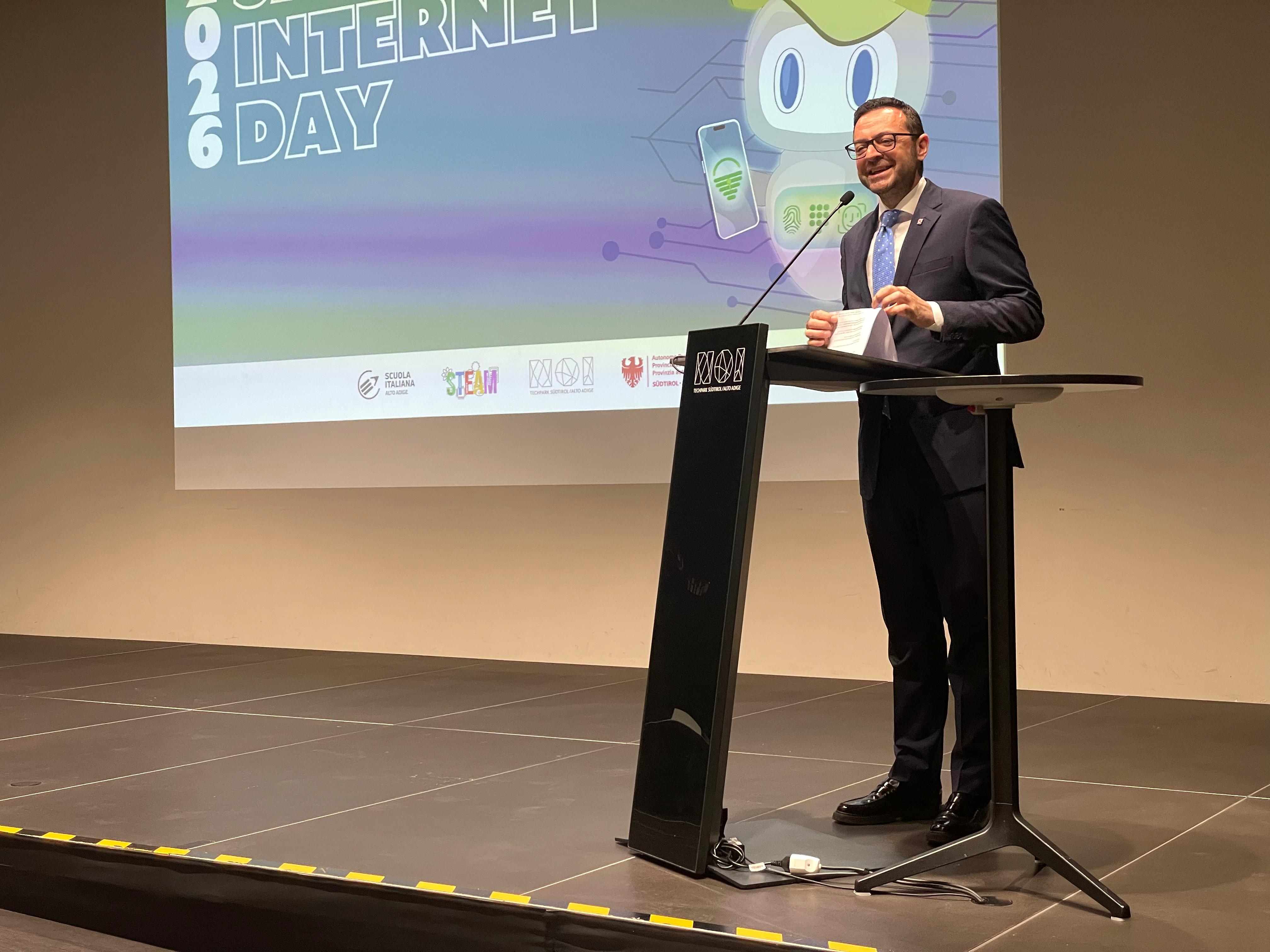 - Es gehe darum, der jungen Generationen beim Verstehen einer immer komplexeren und vielschichtigeren Welt zu begleiten, sagte Landesrat Marco Galateo bei der Veranstaltung zum Safer Internet Day. (Foto: LPA) » [IMG 973 kB]