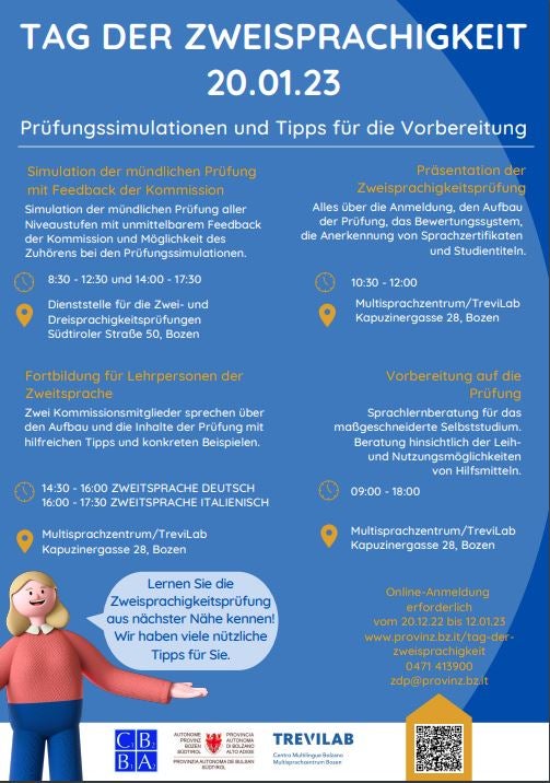 Zu einem Tag der Zweisprachigkeit laden am 20. Jänner die Dienststelle für die Zwei- und Dreisprachigkeitsprüfungen und das Multisprachzentrum. Die ganztägige Veranstaltung bietet Informationen und Vorbereitungsangebote zur Zweisprachigkeitsprüfung. Alles Wissenswerte über die Prüfung, angefangen von der Anmeldung über den Prüfungsablauf mit den vier Modulen und den Bewertungskriterien bis hin zur Anerkennung von Sprachzertifikaten, liefert eine Präsentation im Multisprachzentrum im Kulturzentrum Trevi-TreviLab in der Kapuzinergasse 28 von 10.30 bis 12 Uhr.
